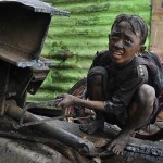 Jakarta, Indonesia: Kristanto, 10, covered with grease and dirt, gathers scrap metal from a burnt bulldozer following bloody clashes between security forces and religious followers in the port district of Tanjung PriokPhotograph: Romeo Gacad/AFP/Getty Images